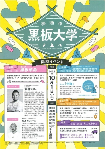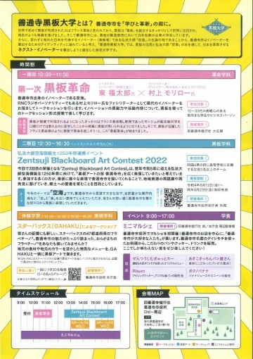 第25回善通寺空海まつりに黒板アートの展示を行います お知らせ 2022年10月31日 10月1日(土)に開催された、『善通寺黒板大学 BLACKBOARD ART CONTEST 2022』の表彰式が行われます! イベント詳細 イベント名:第25回善通寺空海まつり 日時:2022年11月3日(日) 10:00~16:00 場所:総本山 善通寺境内 ~伽藍・誕生院~ (〒765-8506 香川県善通寺市善通寺町3-3-1) 主催:善通寺空海まつり実行委員会 お問合せ:善通寺市観光協会 TEL:0877-63-6315