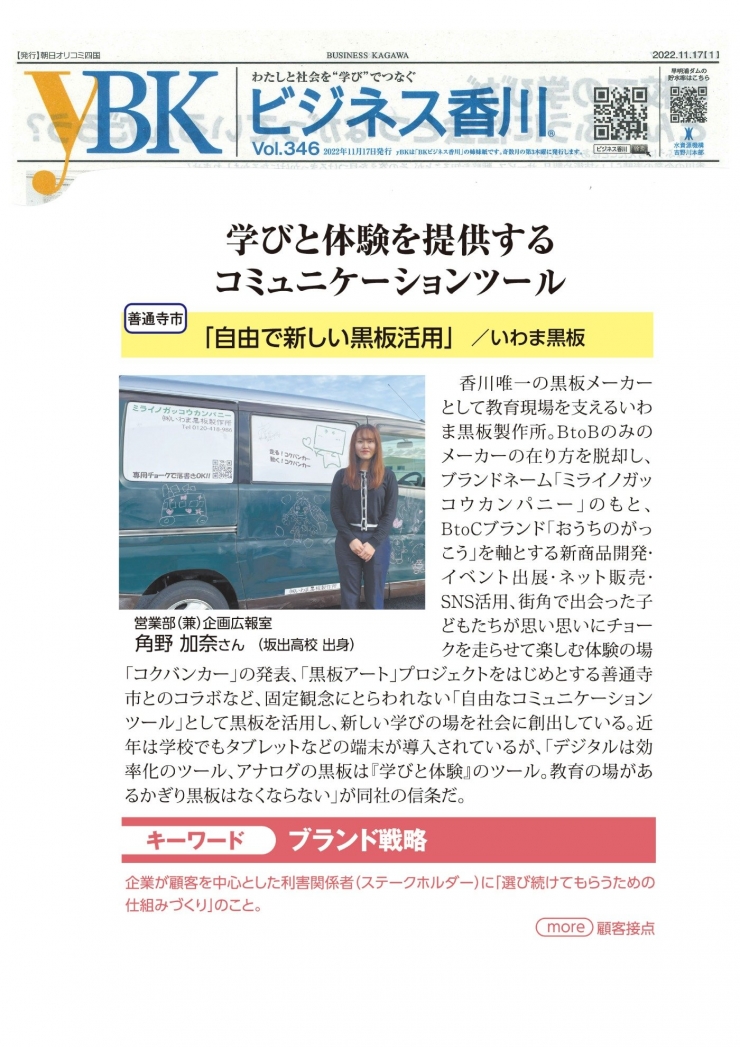 YBKビジネス香川Vol.346に掲載されました。 ニュースリリース 2022年11月17日 ビジネス香川 VOL346 2022.11.17号に 『学校での学びが、どんなふうに会社とつながっているんだろう?』の欄に記事が掲載されました。