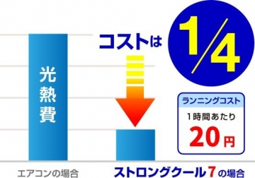 エアコンよりもはるかに省エネで、ランニングコストは1時間当たり20円(電気代:17円・水道代:3円)。ストロングクール7はエコで省エネに優れています。