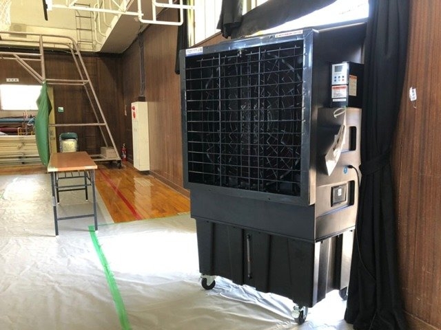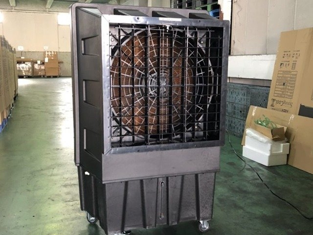 キャスター付きで移動が可能な大型気化式冷風機。工事の必要はなく単相100Vのコンセントと水があればすぐに導入が可能です。強力な冷風機なので、工場、体育館、イベント会場、雨がかからない場所なら屋外でもご使用いただけます。タンクの貯水量は60ℓと大容量なので6~7時間の連続使用が可能です。