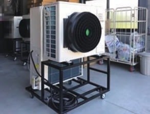 移動が可能な強力スポットエアコンです。キャスター付きの架台に室内機と室外機を一体化することで実現しました。半開放の作業スペース、イベント会場などスポット冷房に最適です。施工不要で三相200Vのコンセントがあればすぐに導入できます。
