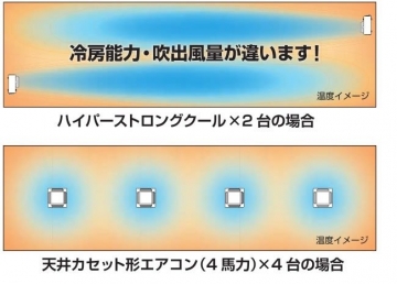 ハイパーストロングクールでは、人間のいる低い位置のみをピンポイントに狙い撃ちします。そのため、室内全体を冷やすためのコストを大幅に削減することができます。