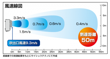 ハイパーストロングクール の風は、直線約50m先にまで届く大風量です。