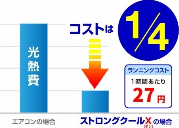 エアコンよりもはるかに省エネで、ランニングコストは1時間当たり27円(電気代:21円・水道代:6円)。ストロングクールXはエコで省エネに優れています。
