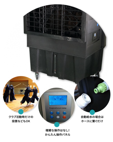 給水方法は手動・自動どちらも対応しています。風量は300㎥/分と強力で20m先まで冷風が届きます。水が蒸発するときに周囲から熱を奪う気化熱の性質を利用しているので、排熱もなく、ノンフロンでCO2の排出を削減でき温暖化対策につながります。