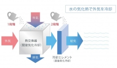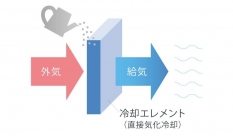 液体が気体に変化する際に周囲から熱を奪う「気化現象」を利用した冷却方式を採用。間接気化冷却と直接気化冷却方式の2段階で冷却を行うことで、排熱を出さずに、冷風を送り出す新システムを実現しました。