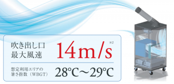吹き出し口最大風速14m/s※2。パワフルな冷却を、狙った場所まで効率よく届けます。想定利用エリア(吹き出し口からの距離1.5m~3m)における暑さ指数(WBGT)は28℃~29℃※3。快適な作業環境を実現します。