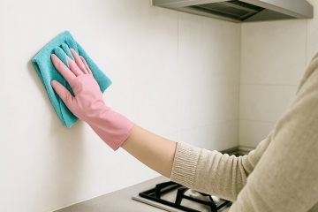 【試験方法】180℃の油を試験板表面に垂らし30日経過後に、水で濡らした雑巾で拭いて表面の油汚れの落ち具合を観察します。