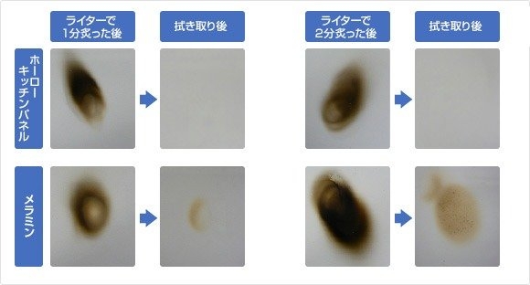 【試験結果】ホーローキッチンパネルは2分炙ったものでも焦げは残りませんが、メラミンでは1分を過ぎると焦げが残って取れません。