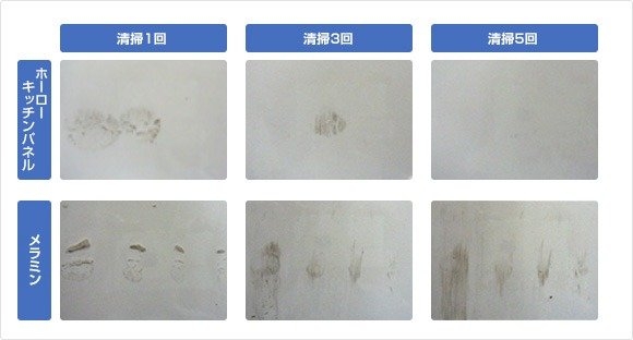 【試験結果】ホーローキッチンパネルは5回繰り返し綺麗に落ちていますが、メラミンでは5回繰り返し後でも汚れは残ります。